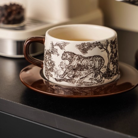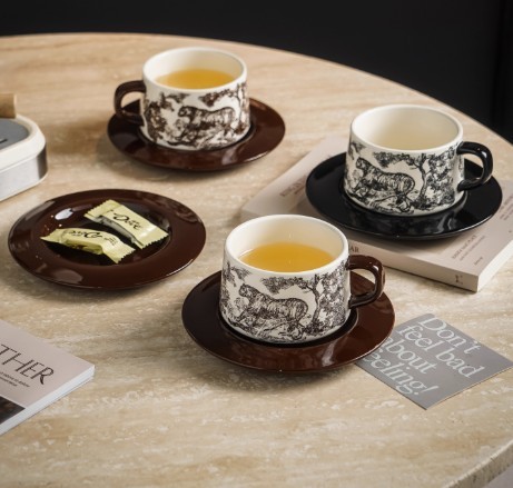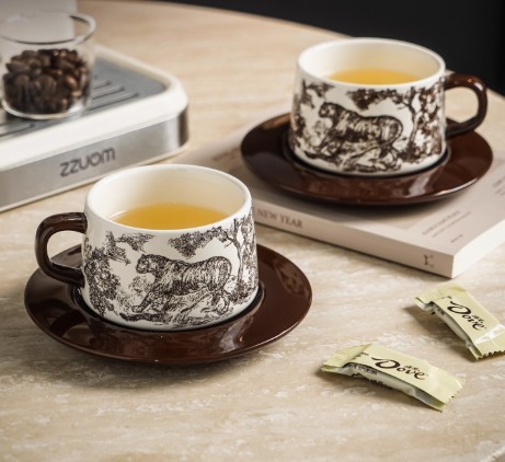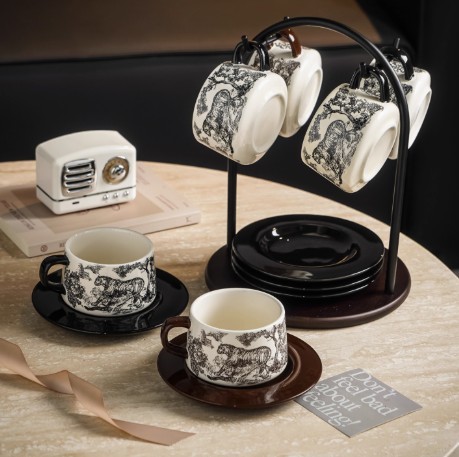 棕色叢林飛碟水俱組6杯6碟配相思木圓管六杯架